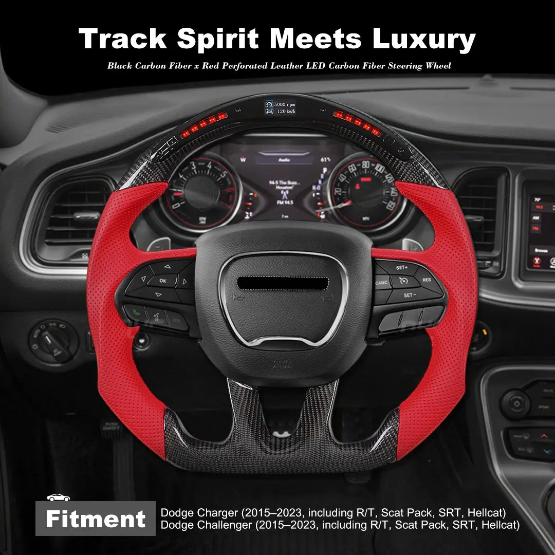 Upgrade your Dodge Charger or Challenger with the premium CarbonTailor Carbon Fiber LED Steering Wheel, designed for Hellcat, Scat Pack, R/T, and SRT trims. Combining advanced LED technology, luxury aesthetics, and precise craftsmanship, this steering wheel delivers both performance and style, making every drive feel like a true track experience.